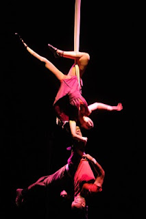 Outro espetáculo maravilhoso que vimos em Brasília, no Teatro Plínio Marcos da Funarte, também a preços baixos, foi o trabalho de dança e técnica circense do grupo Traços Aéreos, daqui mesmo do DF. Tecendo fios d’éter é uma coreografia encenada a dois por Dani Oliveira e Daniel Lacourt em movimentos que exploram tanto a horizontalidade quanto a verticalidade. Eles dançam e dialogam com o corpo, usando técnicas como os panos e cordas pendurados, sobre os quais sobem (e descem), além de água e trapézio, mas com expressividade dramática, não apenas explorando a técnica pela técnica.